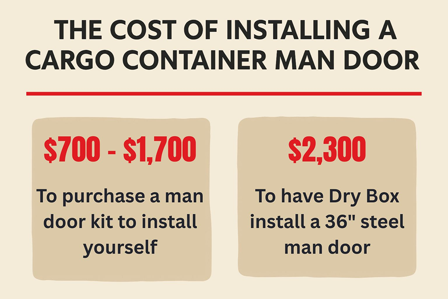 Dry Box offers shipping container modifications like adding a 36 inch steel man door and charges $2,300 for a full installation in one of our containers.